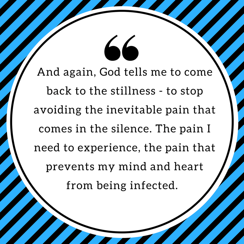 And again, I hear God tell me to come back to the stillness – to stop avoiding the inevitable and necessary pain that comes in the silence. The pain I need to experience, the pain that prevents my mind and heart from being infected.