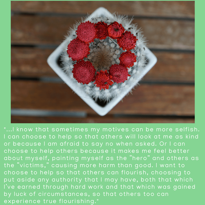 It’s easy to think that, as a social worker, I will automatically engage in this type of leadership. After all, the mission of social work is to bring justice to the vulnerable or oppressed. However, I know that sometimes my motives can be more selfish. I can choose to help so that others will look at me as kind or because I am afraid to say no when asked. Or I can choose to help others because it makes me feel better about myself, painting myself as the “hero” and others as the “victims,” causing more harm than good. I want to choose to help so that others can flourish, choosing to put aside any authority that I may have, both that which I’ve earned through hard work and that which was gained by luck of circumstances, so that others too can experience true flourishing.