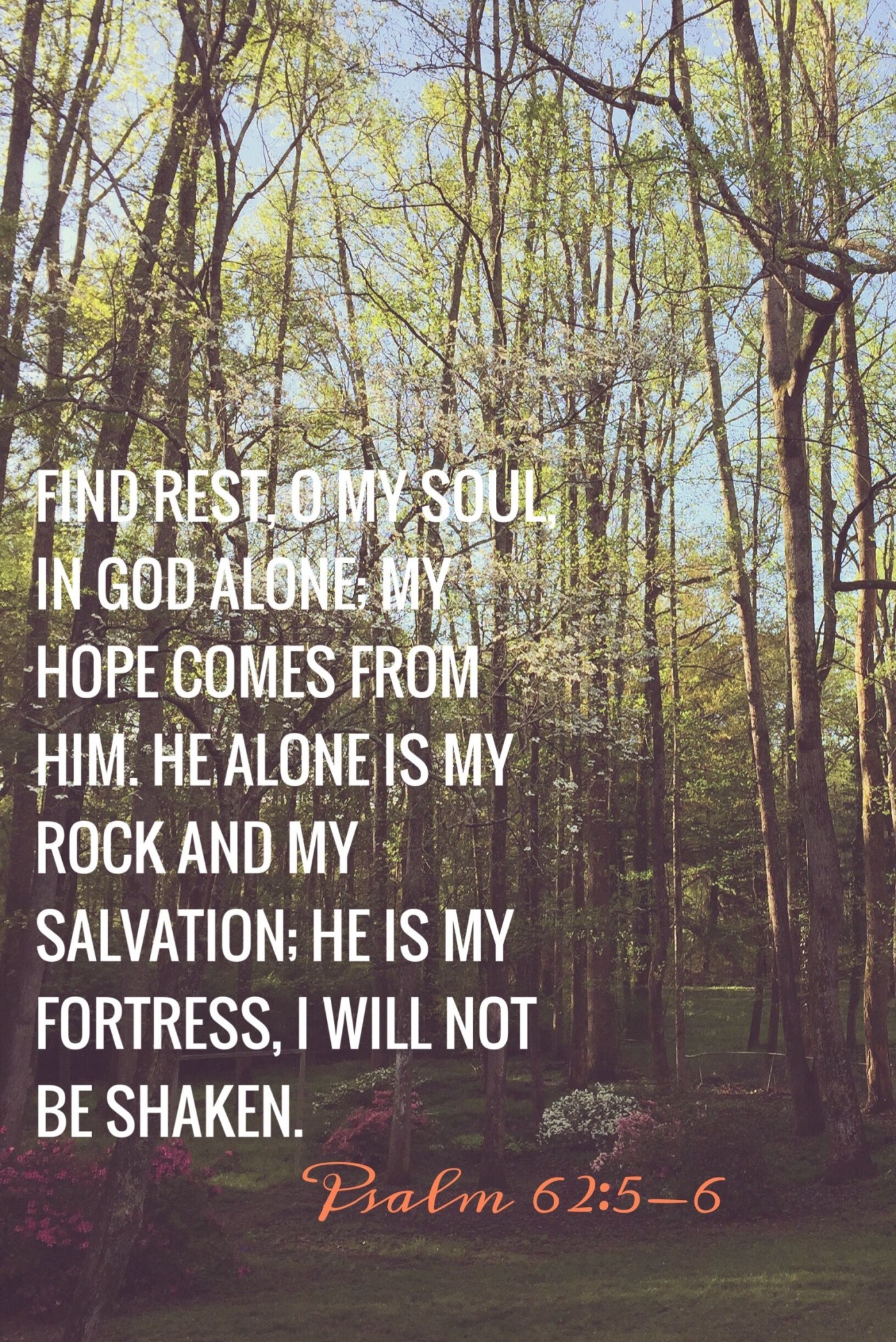 “My soul finds rest in God alone; my salvation comes from him. He alone is my rock and my salvation; he is my fortress, I will never be shaken.” -Psalm 62:1-2
